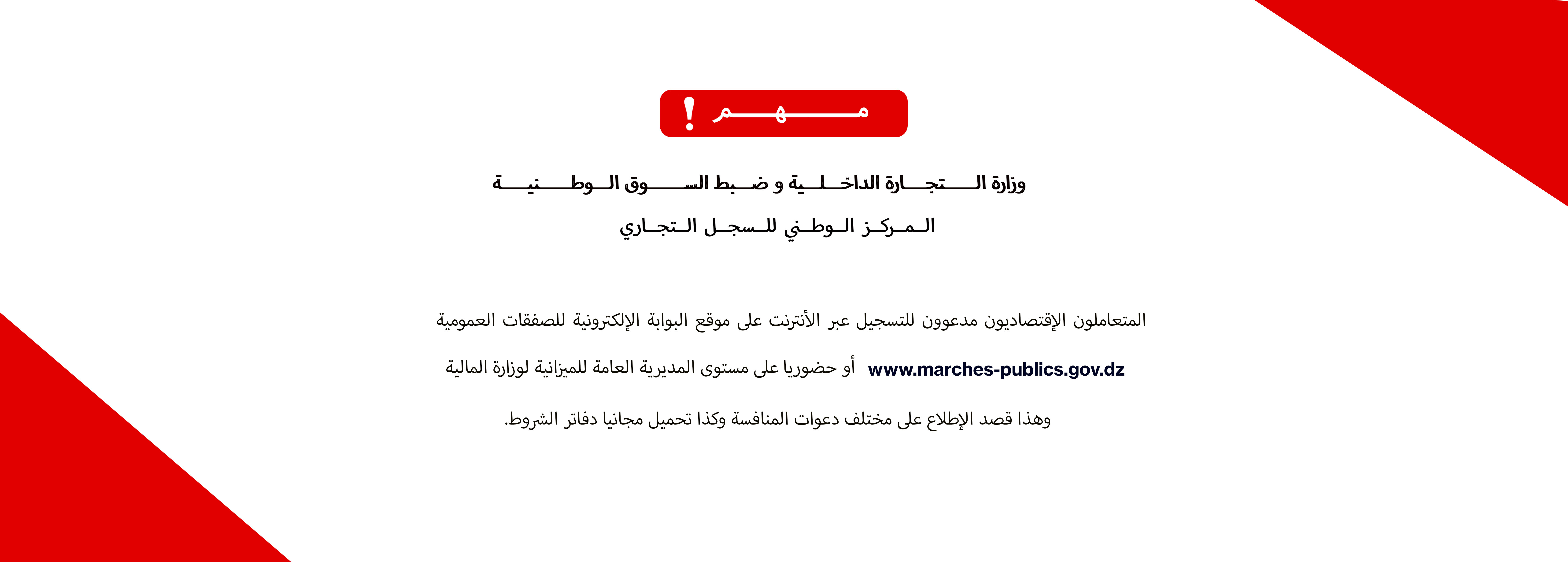 طبقا لأحكام المادة 46 من القانون رقم 23-12 المؤرخ في 05 أوت 2023 المحدد القواعد العامة المتعلقة بالصفقات العمومية و المادة 65 من المرسوم الرئاسي رقم 15-247 المؤرخ في 16/09/2015 والمتضمن تنظيم الصفقات العمومية وتـفويضات المرفق الـعام، يُعلم المركز الوطني للسجل التجاري كافة المتعهدين المشاركين في عروض وطني مفتوح مع اشتراط قدرات دنيا رقم 04/2024 التي تم نشرها في الجريدتين اليوميتين : الشعب و Moudjahid El وكذا في النشرة الرسمية لصفقات المتعامل العمومي " BOMOP " المتعلقة بانجاز الفرع المحلي و السكن الوضيفي للمركز الوطني للسجل التجاري لولاية تيزي وزو.