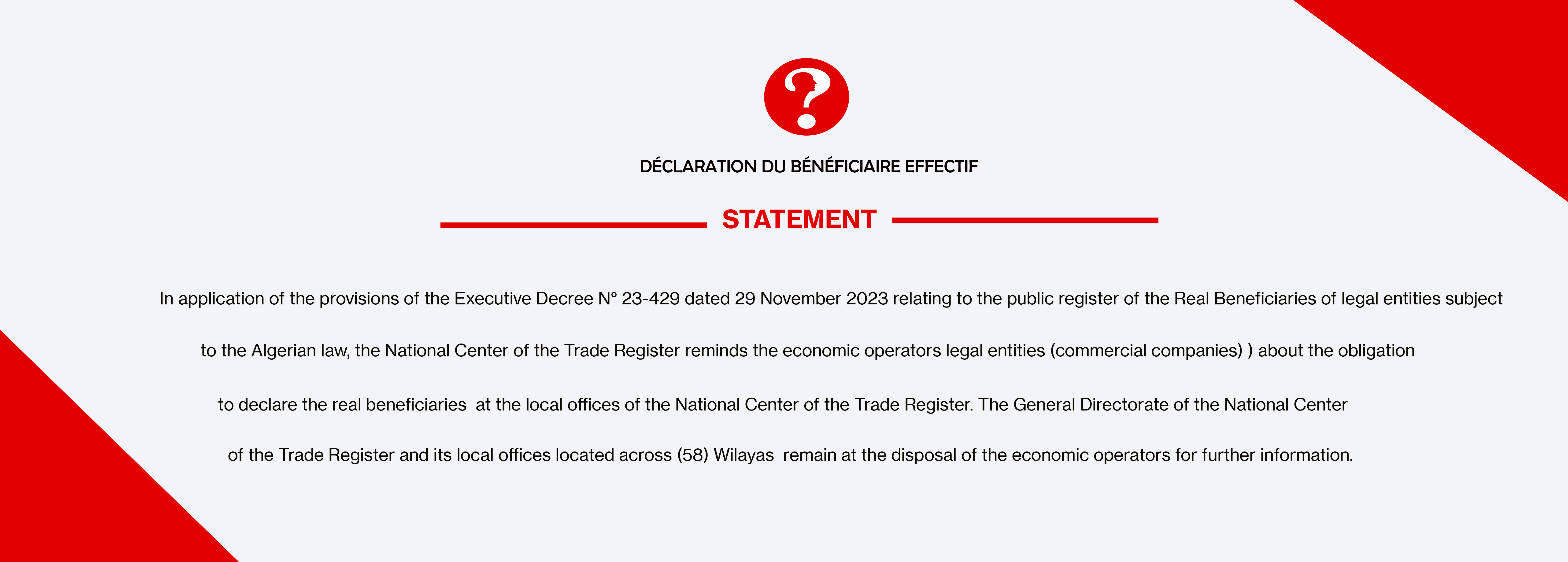 The declaration of real benficiary of legal entities subject to the Algerian law is a mandatory procedure in accordance with the legislation in force, in particular the Law No. 05-01 dated 06 February 2005 on the prevention and combating of money laundering and terrorism financing, amended and supplemented. The service proposed for the online declaration of real benficiary provides greater flexibility and ease for the responsibles of legal entities.